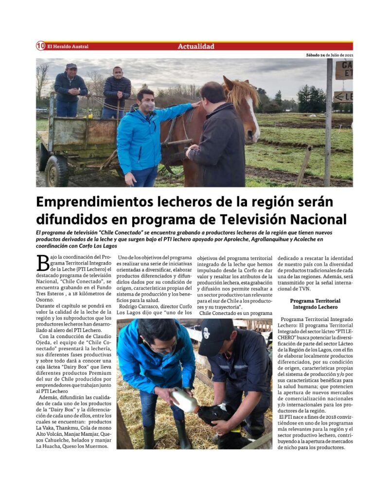 El programa de televisión ‘Chile Conectado’ se encuentra grabando a productores lecheros de la región que tienen nuevos productos derivados de la leche y que surgen bajo el PTI lechero apoyado por Aproleche, Agrollanquihue y Acoleche en coordinación con Corfo Los Lagos Bajo la coordinación del Programa Territorial Integrado de la Leche (PTI Lechero) el […]