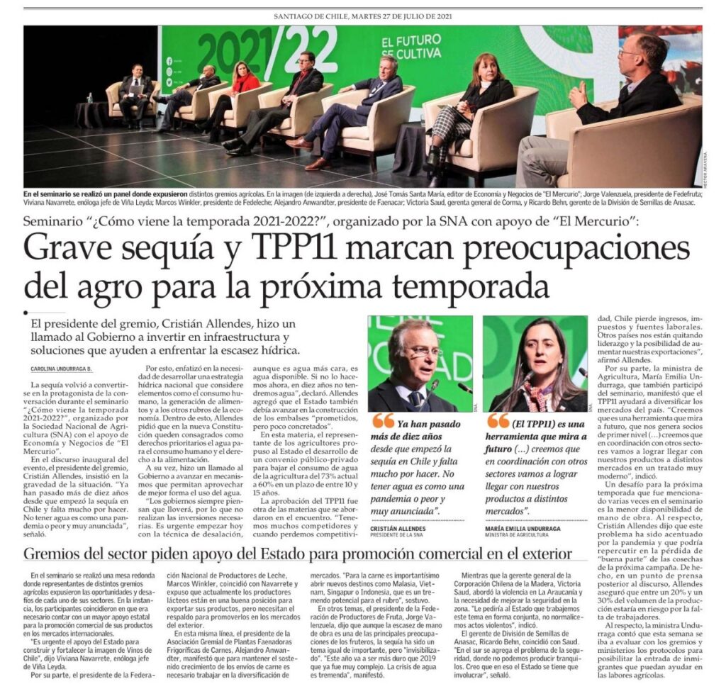 El presidente del gremio, Cristián Allendes, hizo un llamado al Gobierno a invertir en infraestructura y soluciones que ayuden a enfrentar la escasez hídrica. La sequía volvió a convertirse en la protagonista de la conversación durante el seminario ‘¿Cómo viene la temporada 2021-2022?’, organizado por la Sociedad Nacional de Agricultura (SNA) con el apoyo de […]