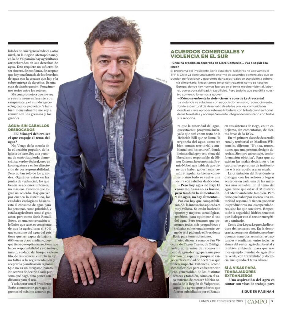 El Mercurio – Revista del Campo Esteban Valenzuela Enfatiza que su objetivo no busca lograr consensos, sino que acuerdos; que su foco estará en temas como la agricultura familiar campesina, la sustentabilidad y el desarrollo regional. Cita a filósofos, pensadores y autores de distintas partes del mundo. Se pasea por nombres de la academia, de […]