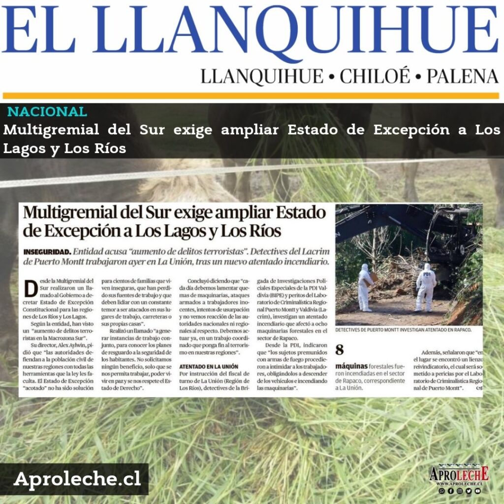 El Llanquihue INSEGURIDAD. Entidad acusa «aumento de delitos terroristas». Detectives del Lacrim de Puerto Montt trabajaron ayer en La Unión, tras un nuevo atentado incendiario. Desde la Multigremial del Sur realizaron un llamado al Gobierno a decretar Estado de Excepción Constitucional para las regiones de Los Ríos y Los Lagos. Según la entidad, han visto […]