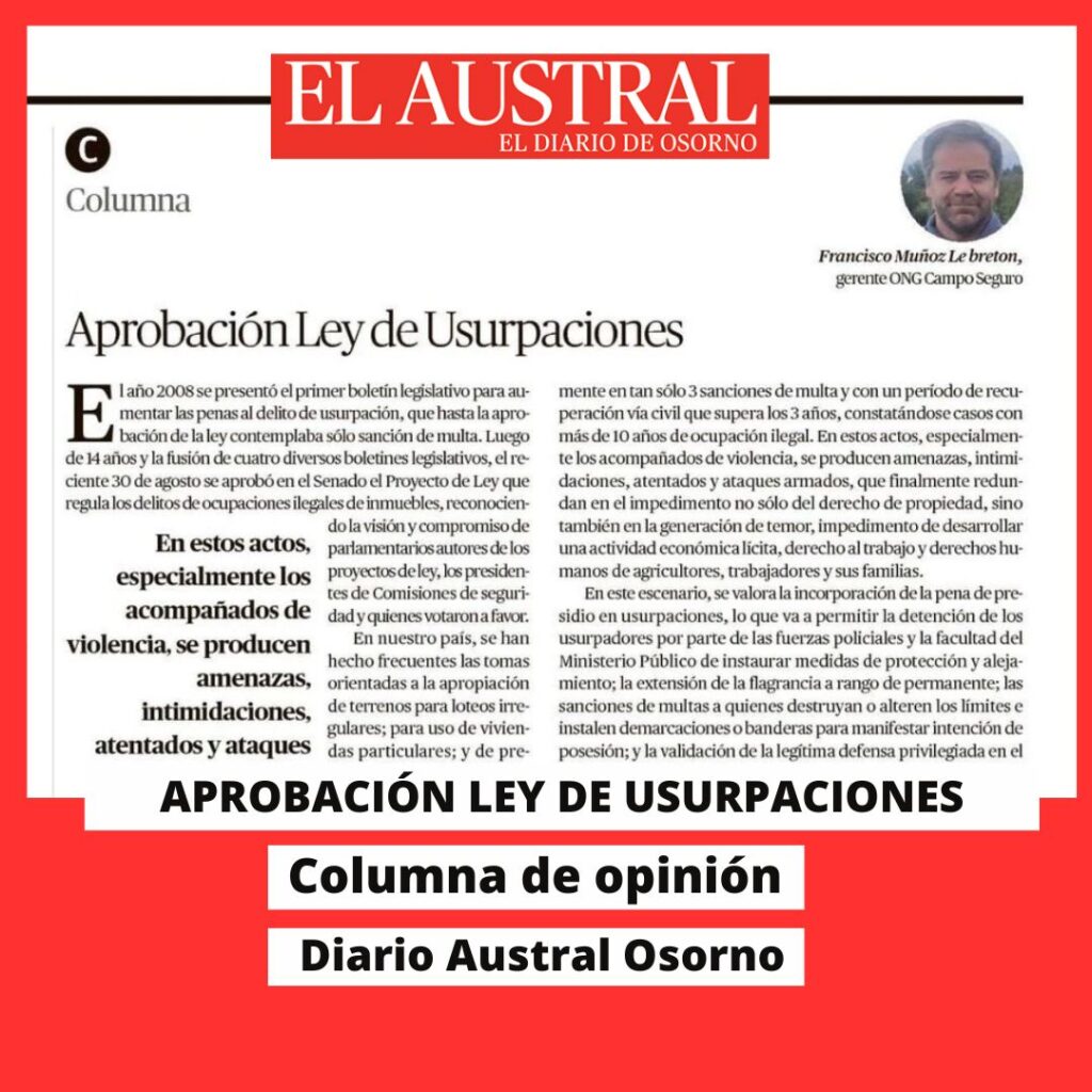 Francisco Muñoz Le breton, gerente ONG Campo Seguro El año 2008 se presentó el primer boletín legislativo para aumentar las penas al delito de usurpación, que hasta la aprobación de la ley contemplaba sólo sanción de multa. Luego de 14 años y la fusión de cuatro diversos boletines legislativos, el reciente 30 de agosto se […]