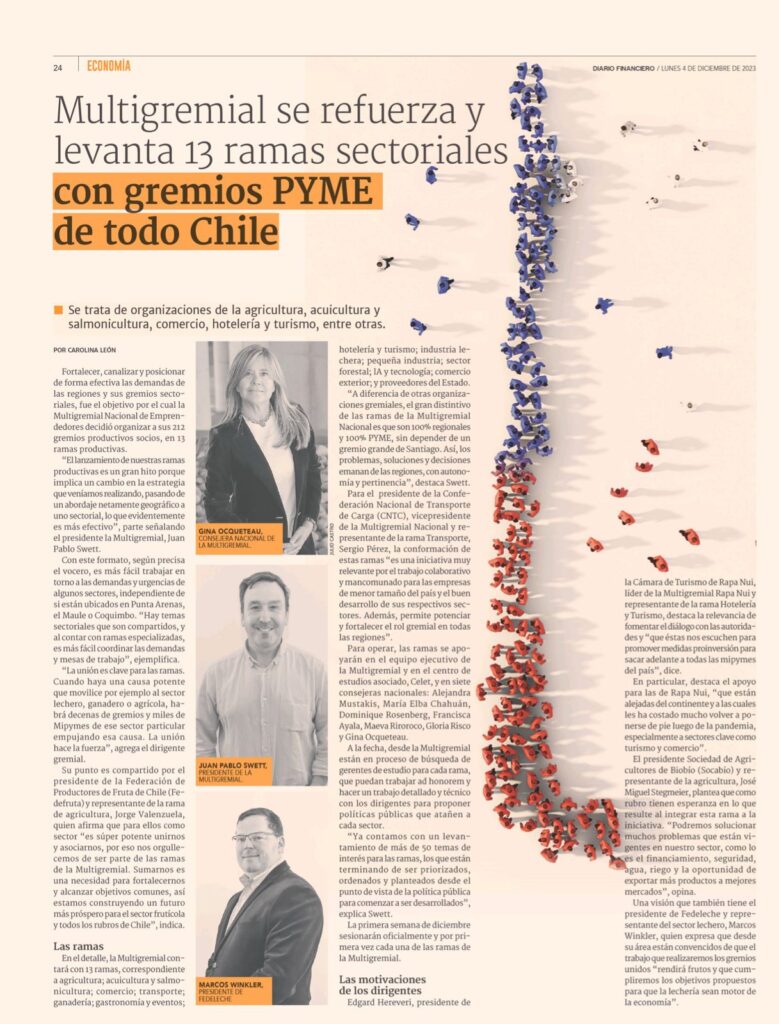 Se trata de organizaciones de la agricultura, acuicultura y salmonicultura, comercio, hotelería y turismo, entre otras. Fortalecer, canalizar y posicionar de forma efectiva las demandas de las regiones y sus gremios sectoriales, fue el objetivo por el cual la Multigremial Nacional de Emprendedores decidió organizar a sus 212 gremios productivos socios, en 13 ramas productivas. […]