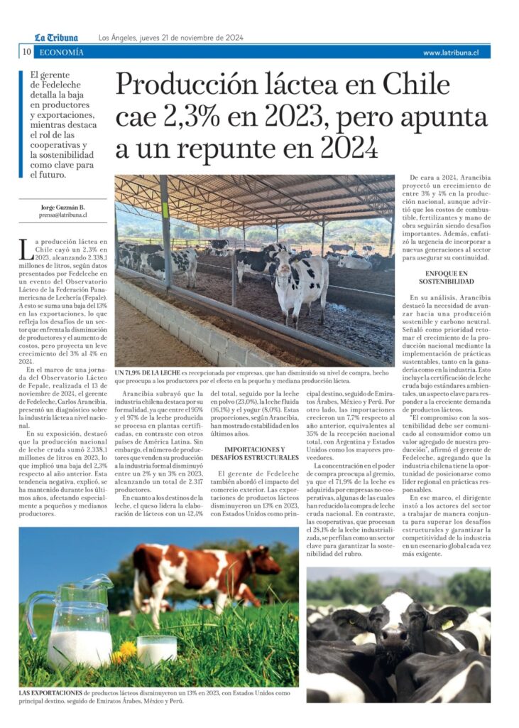 La Tribuna El gerente de Fedeleche detalla la baja en productores y exportaciones, mientras destaca el rol de las cooperativas y la sostenibilidad como clave para el futuro. La producción láctea en Chile cayó un 2,3% en 2023, alcanzando 2.338,1 millones de litros, según datos presentados por Fedeleche en un evento del Observatorio Lácteo de […]