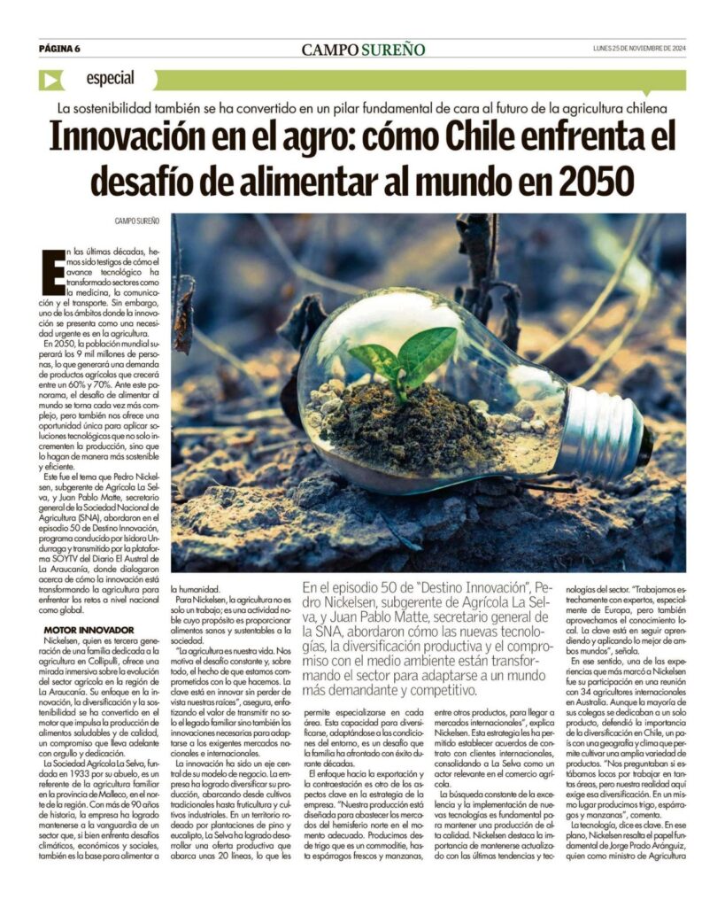 El Austral El Diario de Osorno – Campo Sureño La sostenibilidad también se ha convertido en un pilar fundamental de cara al futuro de la agricultura chilena En el episodio 50 de ‘Destino Innovación’, Pedro Nickelsen, subgerente de Agrícola La Selva, y Juan Pablo Vatte, secretario general de la SNA, aborcaron cómo las nuevas tecnologías, […]