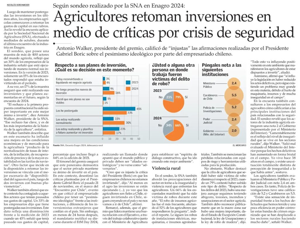 El Mercurio Según sondeo realizado por la SNA en Enagro 2024: Antonio Walker, presidente del gremio, calificó de ‘injustas’ las afirmaciones realizadas por el Presidente Gabriel Boric sobre el pesimismo ideológico por parte del empresariado chileno. Luego de mantener postergadas las inversiones en los últimos años, los empresarios agrícolas comenzaron a retomar los gastos de […]