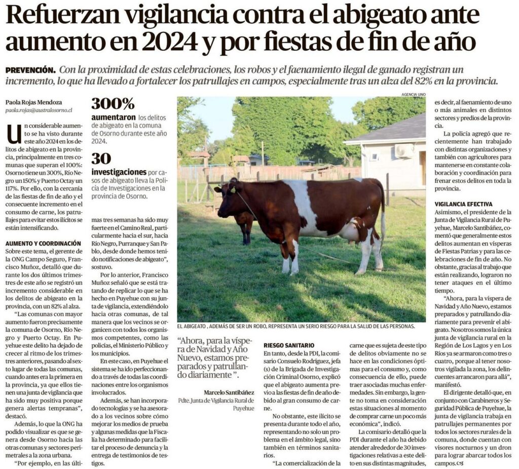 Austral Osorno PREVENCIÓN. Con la proximidad de estas celebraciones, los robos y el faenamiento ilegal de ganado registran un incremento, lo que ha llevado a fortalecer los patrullajes en campos, especialmente tras un alza del 82% en la provincia. Un considerable aumento se ha visto durante este año 2024 en los delitos de abigeato […]