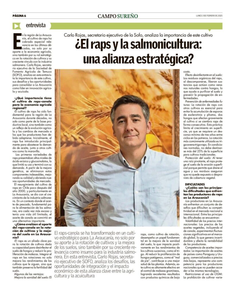 El Llanquihue – Campo Sureño ¿El raps y la salmonicultura: una alianza estratégica? El raps-canola se ha transformado en un cultivo estratégico para La Araucanía, no solo por su aporte a la rotación de cultivos y la mejora de los suelos, sino también por su creciente relevancia como insumo para la industria salmonera. En esta […]