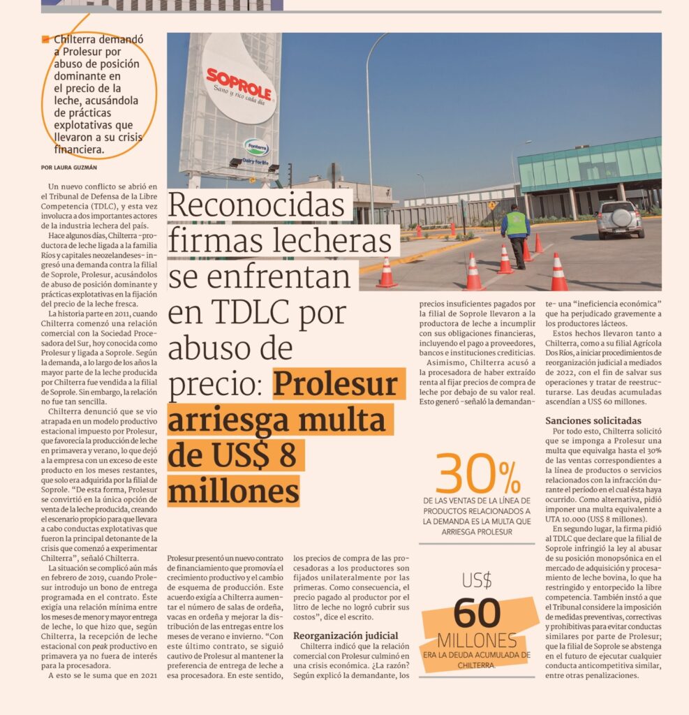 El Diario Financiero Chilterra demandó a Prolesur por abuso de posición dominante en el precio de la Leche, acusándola de prácticas explotativas que llevaron a su crisis financiera. Un nuevo conflicto se abrió en el Tribunal de Defensa de la Libre Competencia (TDLC), y esta vez involucra a dos importantes actores de la industria lechera […]