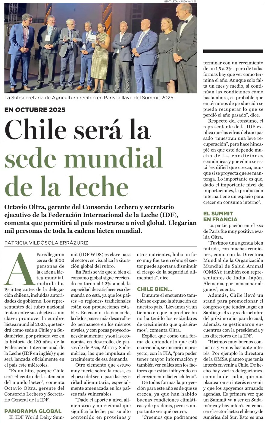 A Paris llegaron cerca de 1600 personas de la cadena láctea mundial, incluida los 19 integrantes de la delegación chilena, incluidas autoridades de gobierno. Los representantes del rubro nacional tenían entre sus objetivos uno clave: promover la cumbre láctea mundial 2025, que tendrá como sede a Chile y a Sudamérica, por primera vez en la historia de 120 años de la Federación Internacional de la leche (IDF en inglés) y que será lanzada oficialmente en el país este miércoles.