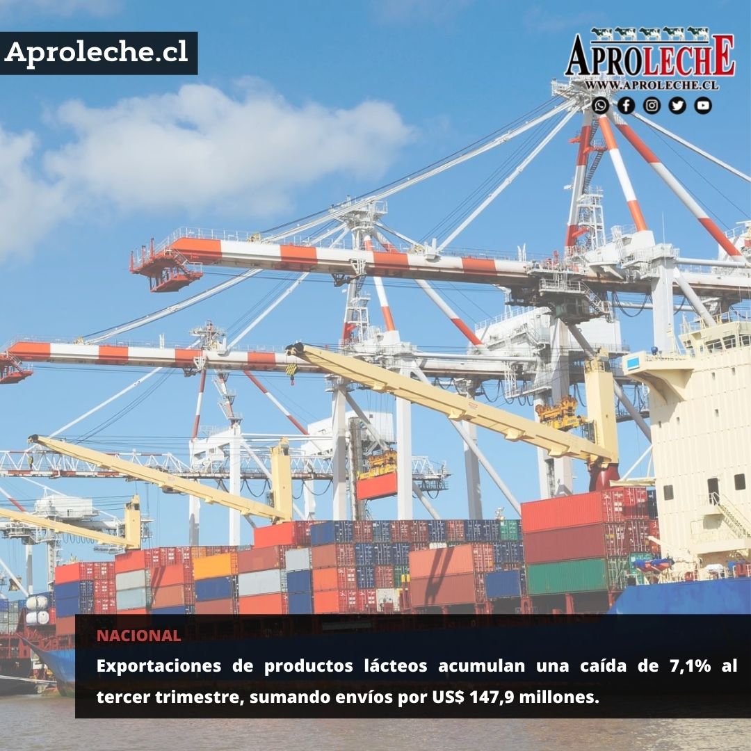 De acuerdo con el avance de datos de Comercio Exterior elaborado por Odepa, y reproducido por Fedeleche, las exportaciones de productos lácteos sumaron US$ 147,9 millones entre enero – septiembre de 2021, lo que representa una caída de un 7,1% frente al mismo periodo del año anterior. La facturación del primer semestre del año se redujo en US$ 11,24 millones comparada con 2020.